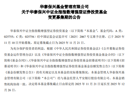 中国经济网北京11月24日电 近日,华泰宝兴基金管理有限公司发布关于华泰宝兴中证全指增强型证券投资基金融资期限变更的公告。公告显示,华泰宝兴中证全指增强型证券投资基金(基金代码:A类:025755、C类:025756)经中国证监会核准注册(证监许可[2025]2067号),于2025年11月10日开始募集,原募集期限为2025年11月21日,募集期限将延长至12月。 2025年12月26日,王凯跃,基金经理候选人,曾任民生证券股份有限公司研究员、投资经理。2024年12月加入华泰宝兴基金管理有限公司。他将于 2025 年 6 月 19 日起担任基金经理。